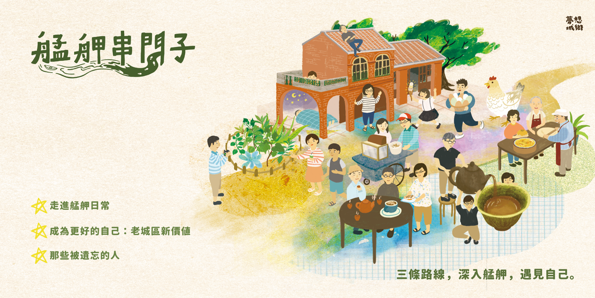 台灣夢想城鄉協會也來到了艋舺,我們攜手經濟弱勢者以及扎根在此的老店家、返鄉創業的青年工作者,共同編織了許多新的故事。很多青年志工、其他的NGO組織,選擇來這裡的理由都不一樣,但是我們手拉手,不想落掉一個人,想織起一張又一張的網,撐著不管有沒有夢想的人。至今我們還是無法具體說艋舺是什麼,可能像一座博物館,不需要打開任何門,直接走進來,用五官感受裡面的紛雜,時代的、人群的、被遺落的、選擇留著的、莫名其妙跑進來的,混著青草香、流汗臭、香火薰、糕餅甜、雞蛋和冰淇淋,對在萬華的人來說,一切在空氣中相會,熟悉的安全感,這是屬於所有人的艋舺。